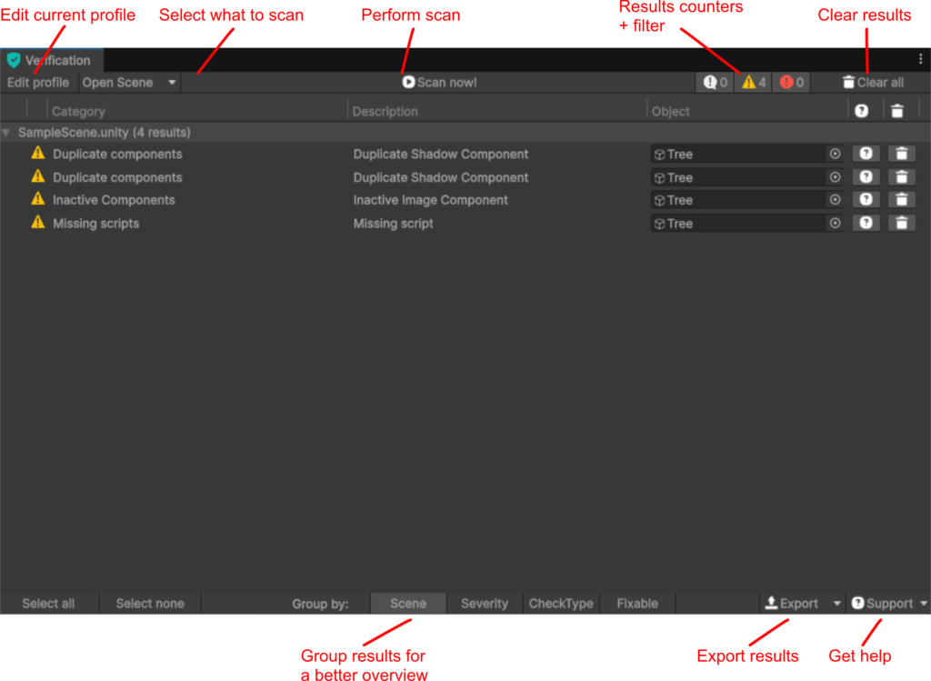 - What to scan: you can scan your current selection, the current open scene, all assets, or the complete project. Depending on the number of objects to scan, the scan might be very fast or take a few seconds. If you scanned multiple scenes, the results list might offer you the option to load into another scene where errors were found.